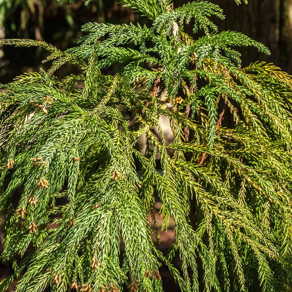 Known as Japanese cedar or sugi, is an evergreen conifer with a pyramidal shape and slender, horizontal branching that is slightly pendulous at the extremities. A monotypic genus unrelated to the actual cedars is the Japanese cedar. It grows naturally as a single trunk tree to a height of 150 feet (rarely higher) with a diameter of 8 feet in forested areas in Japan and China. It is the national tree of Japan, where temples and shrines frequently plant it. It grows significantly more slowly when grown in the U.S., often reaching heights of 50 to 60 feet. Green to blue-green, fragrant, awl-shaped needles that are up to 3/4" long are spirally organized. Touching the foliage feels kind. Cold winters may cause foliage to bronze.