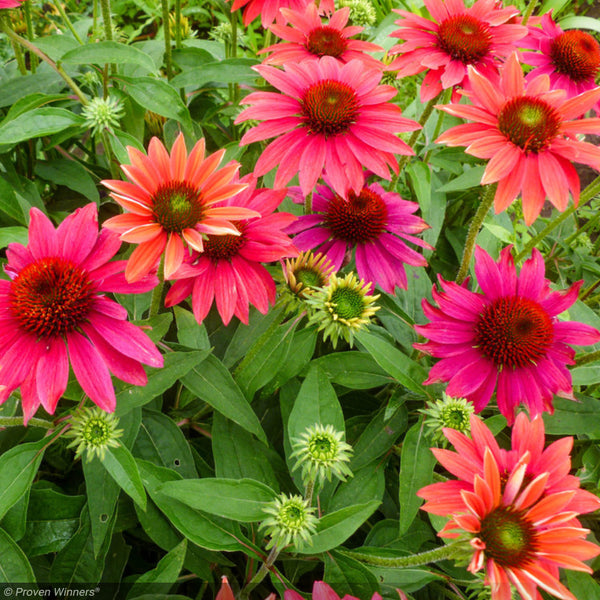 Vibrant blooms in a spicy trio of peachy coral, rose-pink, and magenta that will heat up the summer border! An excellent cut flower that is a must-have for sunny gardens. This drought tolerant perennial was bred for cold hardiness and a compact form with prolific flowering over an exceptionally long season. An herbaceous perennial.