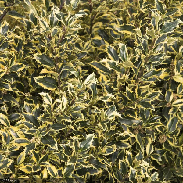 A small evergreen shrub that holds many branches of dense, small, toothy, dark green leaves heavily edged in bright golden yellow. This male form has no berries but will act as a pollenizer for other female English holly varieties. Use to brighten the landscape as a hedge, foundation plant, or landscape accent.