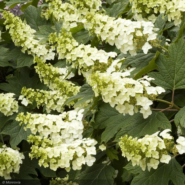 Large, dense, white flower clusters are held upright above the dark green oak leaf-shaped foliage. The midsummer blooms develop a rosy-pink hue in the fall as the leaves turn deep red-bronze. Tan-brown exfoliating bark is attractive in the winter. An excellent landscape specimen or foundation plant. Useful as a flowering hedge plant. Deciduous.