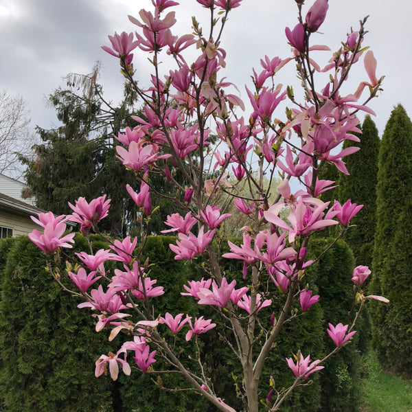 Flowers later than the star magnolia and thus avoids frost damage to the flower buds. Exquisite, 3 to 4 inch blooms, reddish purple outside and white inside, appear before the foliage buds out. A spectacular specimen or accent. Deciduous.