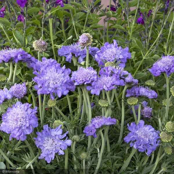 The largest of pincushion flowers to be found with charming, honey-scented, violet-blue flowers. The 3-inch wide blooms rise on stiff, upright stems above a small, naturally compact mound of finely cut, often fuzzy foliage. Excellent cut flowers. Attractive as a border plant, specimen in a rock garden, or in a mass planting. An herbaceous perennial.
