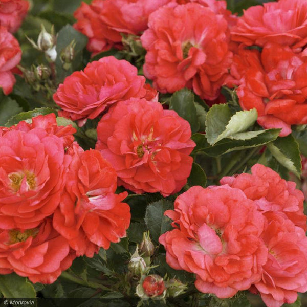 Fill the garden with vibrant, coral-colored flowers from spring to frost. Easy-care, vigorous and cold hardy. Glossy dark green foliage with excellent disease resistance. Low spreading habit is perfect for smaller gardens, filling gently around established plants, in borders or along paths.