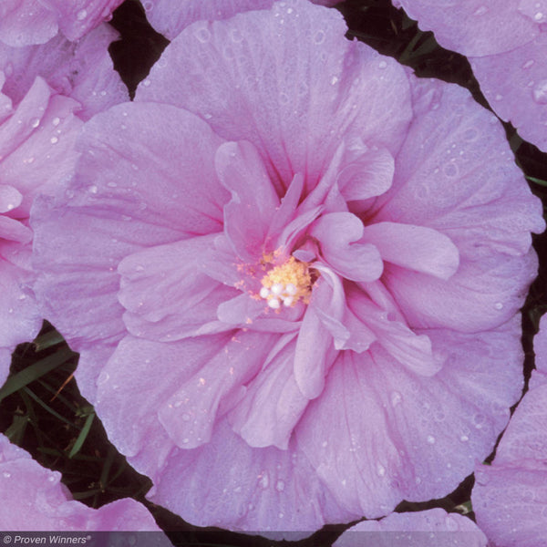 Award-winning Rose of Sharon, Hibiscus syriacus Lavender Chiffon®, is a bushy deciduous shrub known for its big, double, lilac-pink flowers that can measure up to 4 inches (10 cm) wide and with darker veins in the center. Each flower lasts approximately a day and is consistently in bloom from late summer to fall. It stands out against the green foliage of the widely oval leaves. A structural shrub that is particularly good for the back of the border.