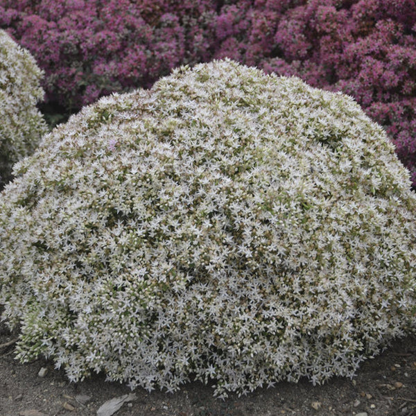 Rock 'N Round® 'Bundle of Joy' Stonecrop (Sedum hybrid) is a charming perennial that adds a vibrant splash of color to any garden with its tight, rounded clusters of bright pink flowers. This low-growing, compact sedum is ideal for creating striking ground cover or adding interest to rock gardens and container plantings. It thrives in full sun and well-drained soil, making it a resilient choice for hot, dry conditions. Its attractive foliage turns shades of bronze and red in the fall, extending its seasonal interest. 'Bundle of Joy' is known for its low maintenance needs and tolerance of drought, making it a versatile and reliable addition to various garden settings.