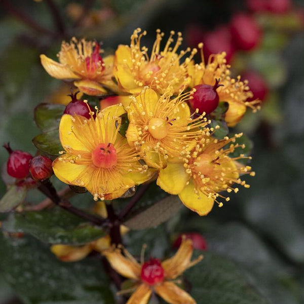 The FloralBerry® Sangria St. John's Wort is a standout perennial known for its striking, deep red berries that contrast beautifully with its lush, green foliage. This compact shrub offers a vibrant display from summer through fall and requires minimal maintenance, making it an excellent choice for both novice and experienced gardeners. With its resilient nature and ability to attract pollinators, it adds both visual interest and functionality to beds, borders, and containers.