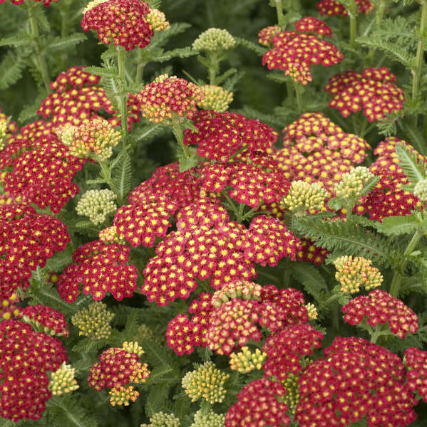 Good-looking, compact, bushy, and heat-loving, Achillea millefolium 'Strawberry Seduction' is a stunning Yarrow with its masses of long-lasting clusters of rich velvety red flowers with bright gold centers. Its pleasantly aromatic, green fern-like foliage is disease resistant and nicely compliments the cheerful flat umbel flowers. Blooming for weeks from early to late summer, this eye-catching beauty easily enlivens any sunny corner of the garden.