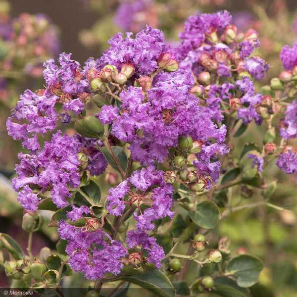 Displays large, long lasting clusters of dark purple crepe-like flowers. Handsome foliage has bronze hue in spring, is bright green in summer, and turns vibrant orange-red in autumn. Mildew resistant. Develops a nicely shaped naturally rounded dome as it matures. Deciduous.