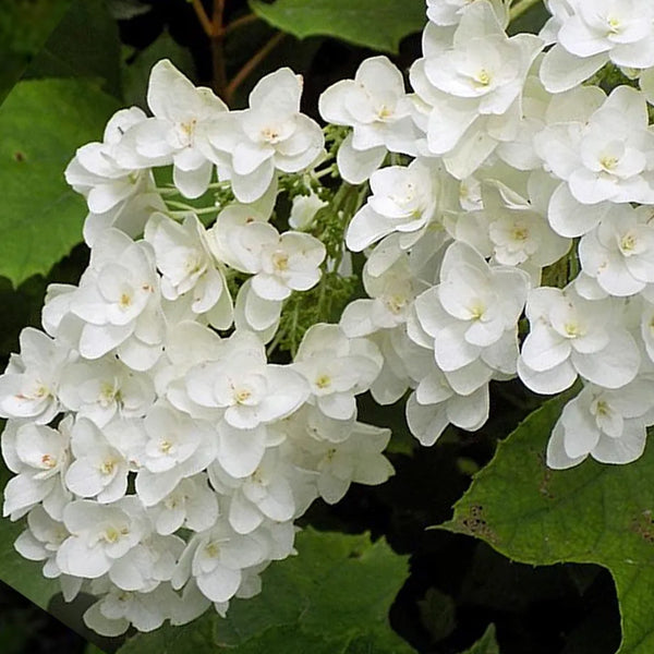 Throughout the summer, this hydrangea is adorned with large, snowy-white flower clusters. This species can survive alkaline soils better than some of its relatives. Its deeply lobed leaves mimic oak leaves. It can tolerate moderate shade, but it requires plenty of water to grow.