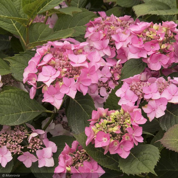 Delicate lacecap blooms smother this compact hydrangea. An excellent repeat bloomer that is ideal for a shady space. Blooms will be blue in acidic soils and more pink in neutral to alkaline soils. A perfect landscape accent or patio container specimen. Wonderful cut or dried flowers. A Monrovia exclusive 2017 introduction. Deciduous.