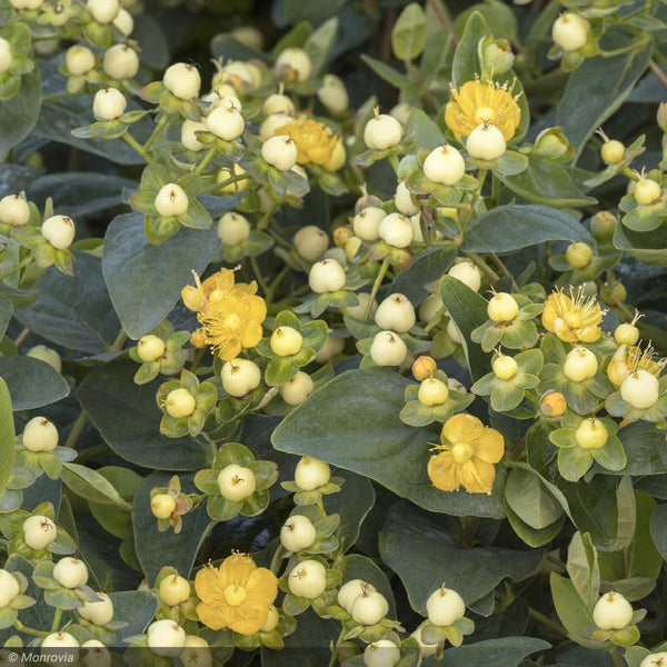Buttery yellow cup-shaped flowers produce clusters of lovely creamy white berries on well-branched, rust resistant plants with handsome dark green foliage. A fuss-free deciduous shrub ideal for borders and containers. Use as a specimen or low hedge, or plant in showy drifts. Stems of fall berries are a wonderful accent in cut flower arrangements.