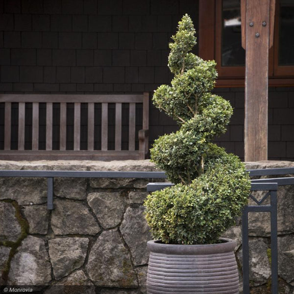A vigorous evergreen shrub with bright green foliage that retains good color throughout winter. The upright, naturally cone-shaped habit makes it an excellent candidate for topiary forms, and a striking container or formal garden accent. Use in mass plantings to create either a free-form or a sculpted hedge.