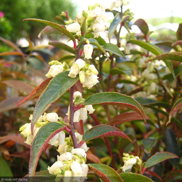 Small evergreen shrub displays leathery, rich green leaves on upright spreading branches. Urn-shaped flowers in short clusters appear from the leaf axils. Excellent companion plant for Rhododendrons.