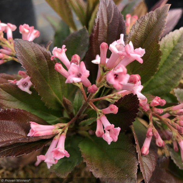 Sweet Talker viburnum doesn’t need the gift of gab to charm you: it does it all by being one of the very first shrubs to bloom in late winter/early spring. Look forward to hundreds of pink, trumpet-shaped flowers that emit a spicy honey scent, even in those first early days of spring sunshine. The rest of the year, enjoy very handsome leathery foliage that is ideal for landscaping around your home, gardens, or hedging. Foliage takes on dramatic purple-burgundy tones in cool weather.
