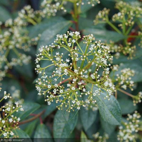 Satisfy your need for handsome, high-quality foliage with Yang viburnum! This innovative new selection from Dr. Tom Ranney combines the timeless, sophisticated evergreen foliage of David viburnum with the heat tolerance of Chinese viburnum for a useful plant that goes well beyond its former mild-climate-only range. Thick, leathery leaves are deeply veined and are accompanied by white flowers in spring. If planted with companion Yin viburnum, you'll also look forward to amazing blue fruits. It's a true four-season beauty!