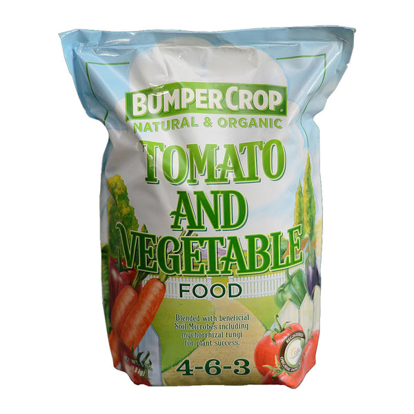 Master Nursery® Bumper Crop® Natural & Organic Tomato and Vegetable Food is a blend of natural ingredients formulated for use throughout the vegetable garden as well as with soft fruits like strawberries and acceptable for use in organic production. It will contribute to even plant growth without producing excessive foliage at the expense of fruit. The additional phosphate helps to ensure the production of high quality fruits and vegetables. Its calcium aids in preventing disorders like blossom end rot.