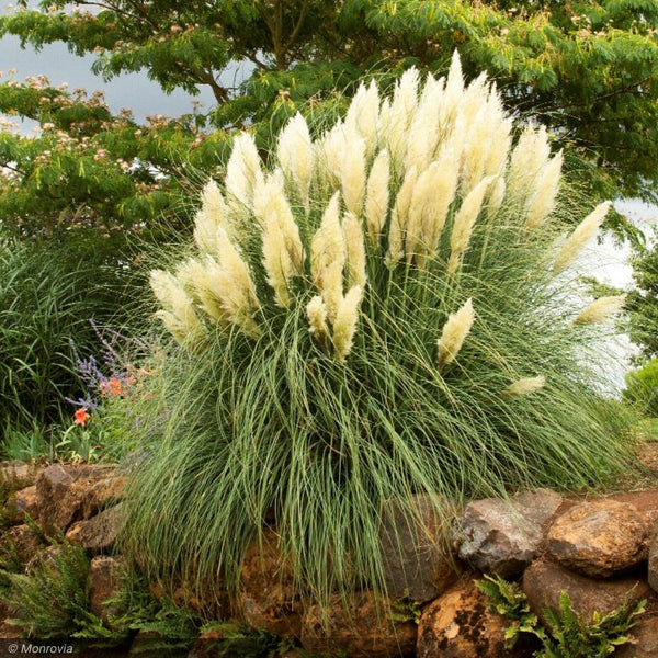 A beautiful landscape specimen prized for its handsome fall flowers. The long stalks of dramatic, creamy white plumes are held above the dense clump of green foliage. This perennial grass is wind and drought tolerant, and provides a showy windbreak or screen. The smaller dwarf form is well-suited to smaller gardens and landscapes.