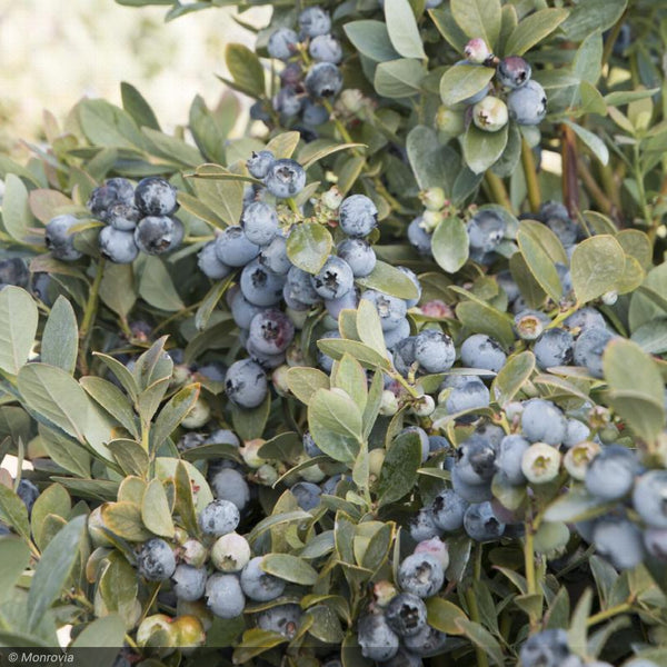 An award winning variety with the bluest of foliage! Pink-blushed flowers produce a big crop of large, sweet, juicy berries on a compact, mounded shrub. Perfect for hedges or planting in large tubs. Self-fertile, though planting with another variety may increase yields. Needs only 150-200 winter chill hours. Semi-evergreen in mild climates.