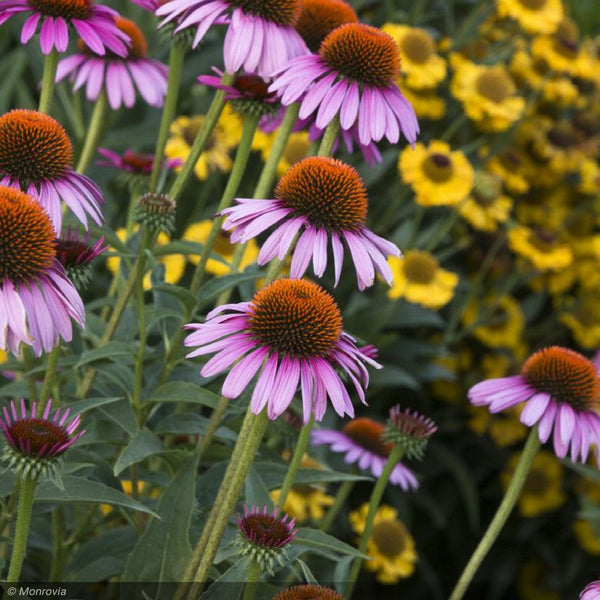 Flower petals are first held horizontally, then relax as the flowers age and the cone-like centers become more pronounced. The bright purple-pink, daisy-like flowers on sturdy stems make great cut flowers. An ideal choice for adding color to sunny, waterwise borders and mixed containers. An herbaceous perennial.