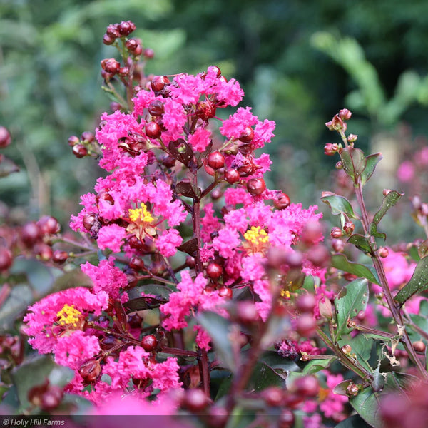 The Pink Velour Crape Myrtle gives the traditional pink blooms you adore with a modern twist: in the spring, its rich wine-red leaves turn into dark purplish-green leaves in the summer, creating the ideal setting for its brilliant magenta flowers.
