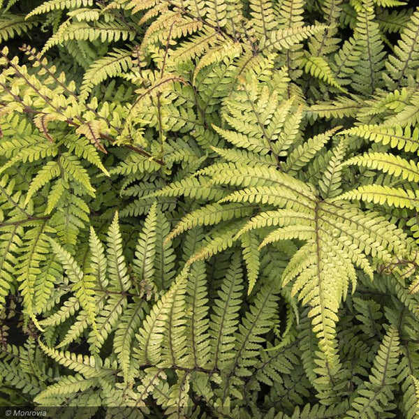 Add airy, feathery texture to a shady spot with the arching fronds of this clump-forming fern. Pale green fronds unfurl from red stems, creating a two-toned look with the older, dark-green foliage. Excellent in a woodland garden combined with bold-leaved plants such as hostas and brightly colored heucheras. An herbaceous perennial.