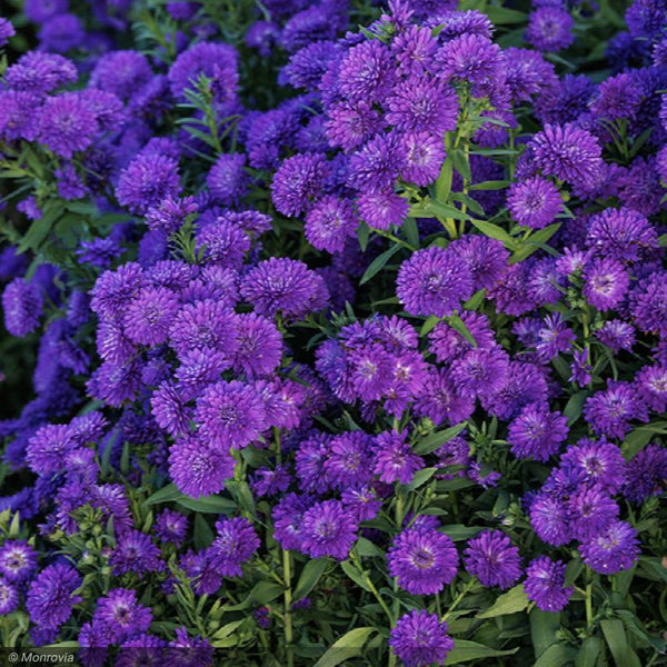 Violet-blue flowers have petals so abundant, they almost form a pom-pom shape. Adds intense color to the late-season garden. Compact and bushy, filling out a container well on its own. Also excellent massed in a perennial bed. Herbaceous perennial.