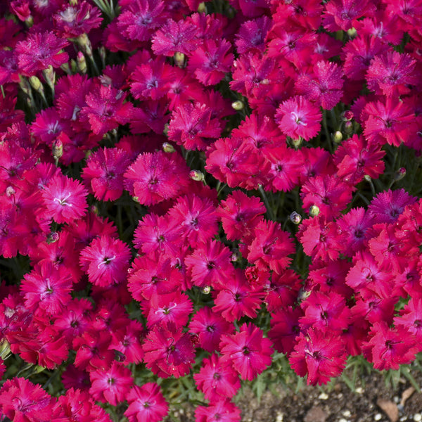 'Paint the Town Red' Pinks is a vibrant, low-growing perennial that features bright, fiery red blooms set against deep blue-green foliage. These flowers, known for their long bloom period, are perfect for adding a burst of color to garden borders, containers, and rock gardens. With excellent heat tolerance and low maintenance needs, this hybrid Dianthus is a reliable performer in sunny locations, attracting pollinators and providing striking visual appeal throughout the growing season.