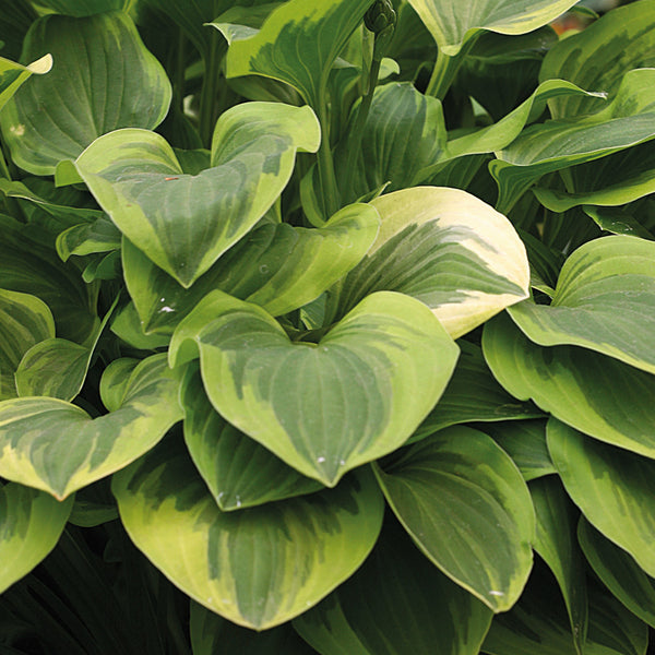An award winning small to medium-sized hosta, perfect for edging borders and garden walkways. Foliage transforms as it ages from green with chartreuse, irregular margins to yellow, then fades to a soft creamy color with chartreuse streaks. Showy scapes of purple flowers appear in summer. An herbaceous perennial.