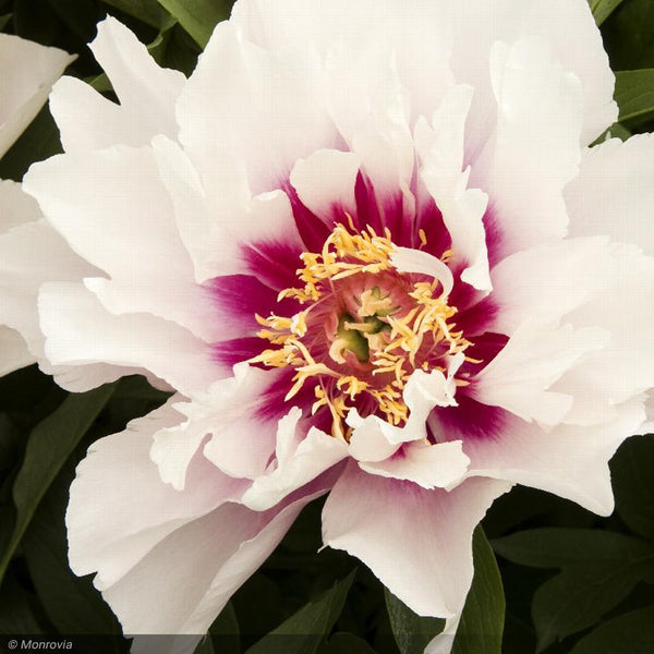 Large, semi-double, lightly fragrant blossoms, white with striking dark lavender central flares, stand above lush, toothed foliage. An especially vigorous plant - producing up to 50 blooms in a single season; the sturdy flower stems require no staking. A wonderful addition to any spring bouquet. An herbaceous perennial.
