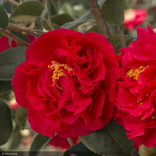 Deep red buds open to magnificent peony-like, rosy-red flowers with a delightful fragrance. The mid-season blooms create a dazzling contrast against the glossy, dark green foliage, brightening lightly shaded settings. Stunning in woodland borders and foundation plantings, or as a hedge. An old favorite for milder regions of the U.S. Evergreen.
