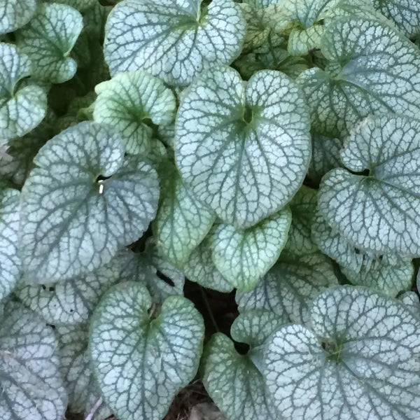 Heart-shaped silver leaves delicately veined with light green brightens any shady area. Sky-blue, forget-me-not flowers add extra color in the spring. Mass plant as a striking groundcover or spot into mixed beds. An herbaceous perennial.