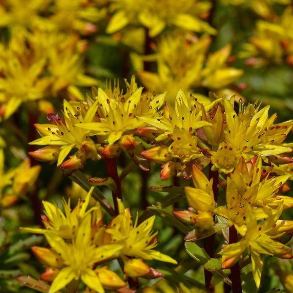 This low-growing sedum produces a lot of flowers and has dependable, dark bronzy green leaves. The cheery red of new spring foliage is lovely. Golden yellow with pinkish orange overtones, prolific star-shaped flowers cover the plant twice during the growing season. Plants only reach heights of 2-4 inches and widths of 10 inches.