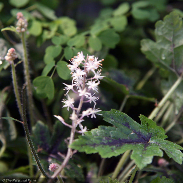 This particular foamflower variety features attractive light green leaves adorned with dark maroon patterns running along the veins. It represents an early hybridization between eastern and western Tiarellas and has undergone additional breeding to contribute to the wide array of foamflower cultivars found in modern gardens.