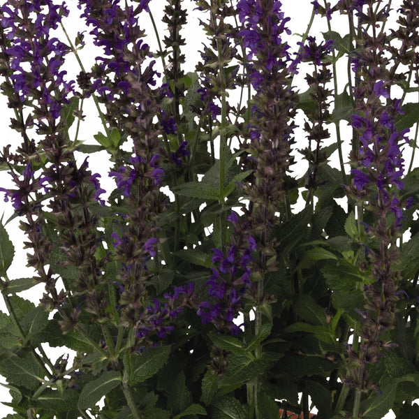 Perennial Sages are invaluable additions to borders, forming compact clumps with grey-green leaves. They boast dark purple flower spikes on dark stems, attracting butterflies and hummingbirds in early summer. Prune faded flowers for re-blooming or cut back after flowering. These plants tolerate drought and can be easily divided every 3 to 4 years in spring. Ideal for both aesthetics and cutting.